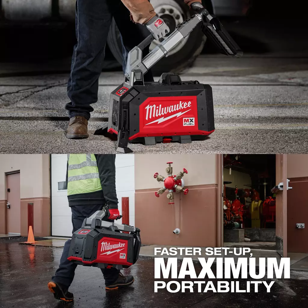 Nuestra torre de iluminación compacta MX FUEL™ ROCKET™ de doble potencia es nuestra torre de iluminación con mayor densidad de potencia, ofreciendo excepcionales capacidades de iluminación en un tamaño compacto. La unidad proporciona hasta 15 000 lúmenes de iluminación para tareas y áreas. Cubre más de 210 m² y proporciona 5 veces más iluminación útil que una torre de iluminación M18 ROCKET™ de doble potencia. Esta torre compacta ofrece máxima portabilidad, requiriendo un 75 % menos de espacio para almacenarla y transportarla que la torre de iluminación/cargador MX FUEL™ ROCKET™. Su base moldeada resistente a impactos se conecta al sistema de almacenamiento modular MILWAUKEE® PACKOUT™ mediante grapas de bloqueo integradas para una portabilidad inigualable en el lugar de trabajo. Cuenta con un asa de transporte extragrande y pesa menos de 22,7 kg con la batería MX FUEL™ REDLITHIUM™ XC406 incluida. Con la batería incluida, la unidad funciona hasta 3 horas en modo alto o hasta 10 horas en modo bajo, ofreciendo una iluminación potente sin cables ni generadores. La función de doble alimentación permite conectarla para usarla todo el día. El mástil plegable de 2,13 m (7 pies) se despliega rápidamente en segundos. La torre de iluminación compacta cuenta con dos estabilizadores desplegables para mayor estabilidad y facilidad de uso en terrenos irregulares. La unidad no solo es portátil y rápida de instalar, sino también duradera, con clasificación IP56 de protección contra el agua y el polvo, lo que la hace apta para su uso tanto en interiores como en exteriores. La tarjeta Bluetooth ONE-KEY™ incluida le permite retirar, reemplazar o actualizar la conectividad durante la vida útil de su máquina. Totalmente compatible con nuestro sistema de equipo MX FUEL™.